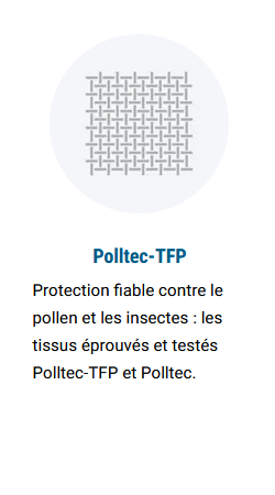 Polltec TFP est particulièrement convaincant en raison de sa perméabilité à l’air et à la lumière améliorée tout en offrant simultanément une bonne protection contre le pollen et les insectes.